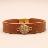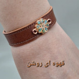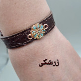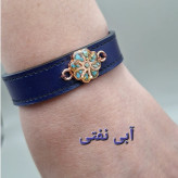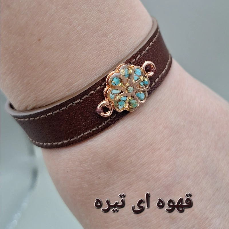 دستبند چرم طبیعی گاوی با رکاب مس و فیروزه طبیعی کد 03
