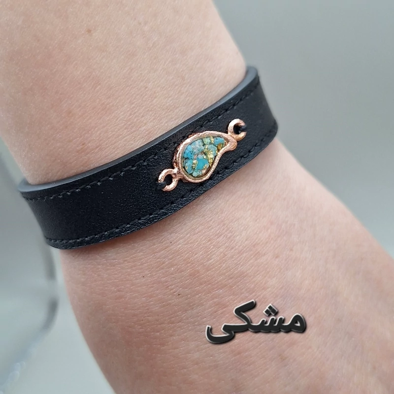 در مرکز دستبند، رکابی از فلز مس قرار گرفته که با فیروزههای طبیعی، رزین شفاف و ورق طلا تزئین شده و جلوهای چشمنواز و خاص به آن داده است.