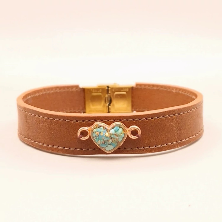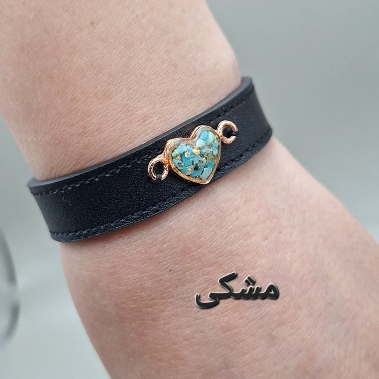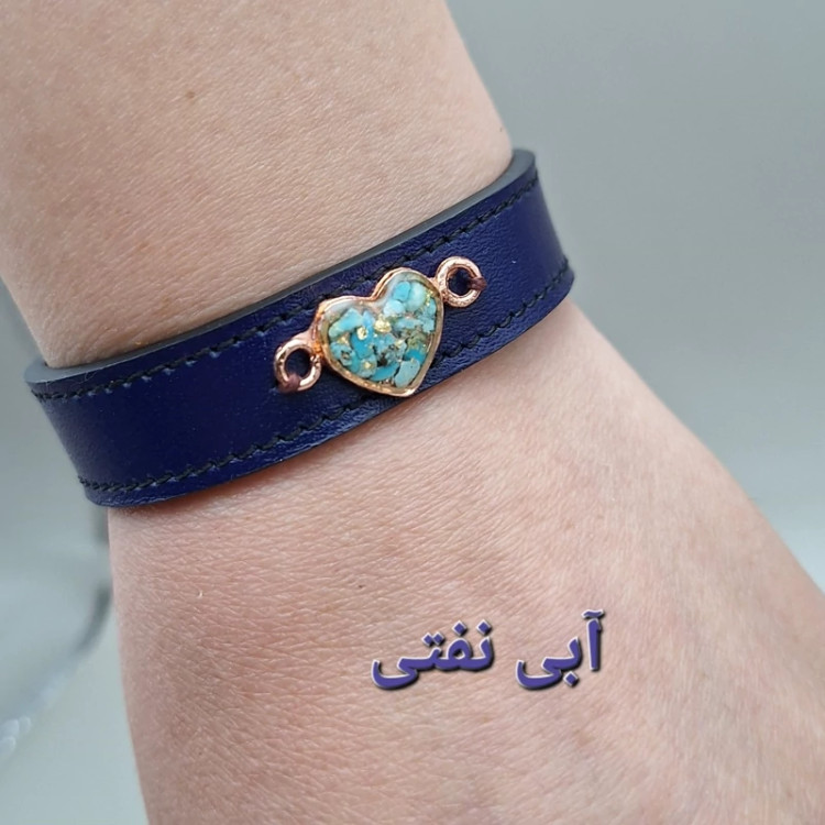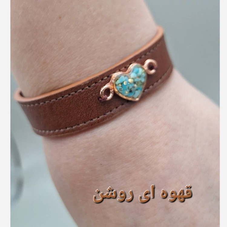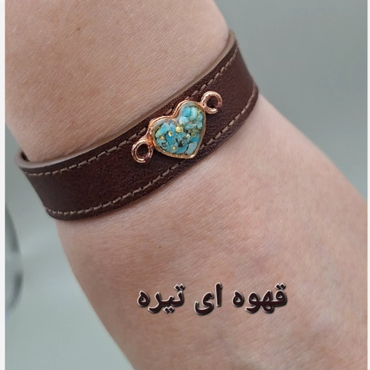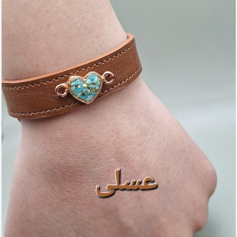 در مرکز دستبند، رکابی از فلز مس قرار گرفته که با فیروزههای طبیعی، رزین شفاف و ورق طلا تزئین شده و جلوهای چشمنواز و خاص به آن داده است.