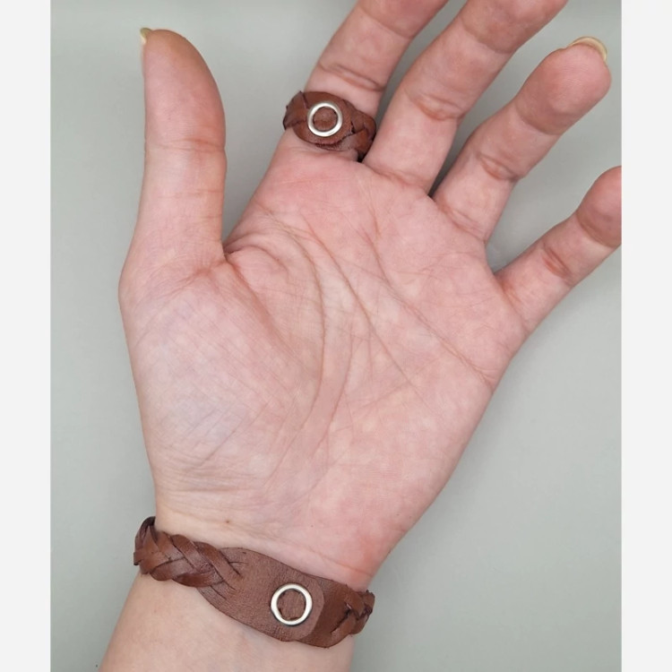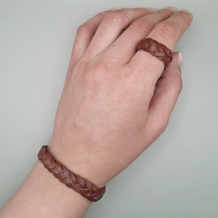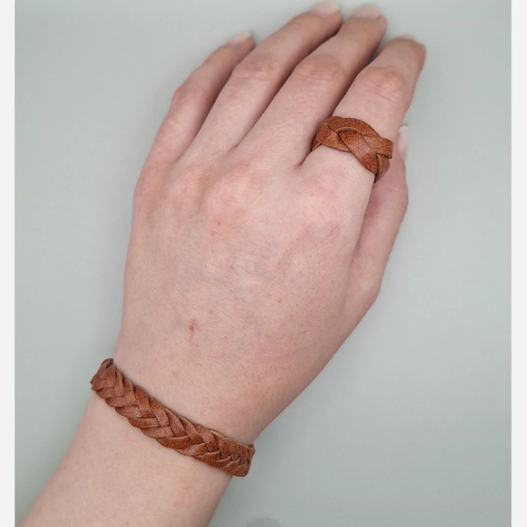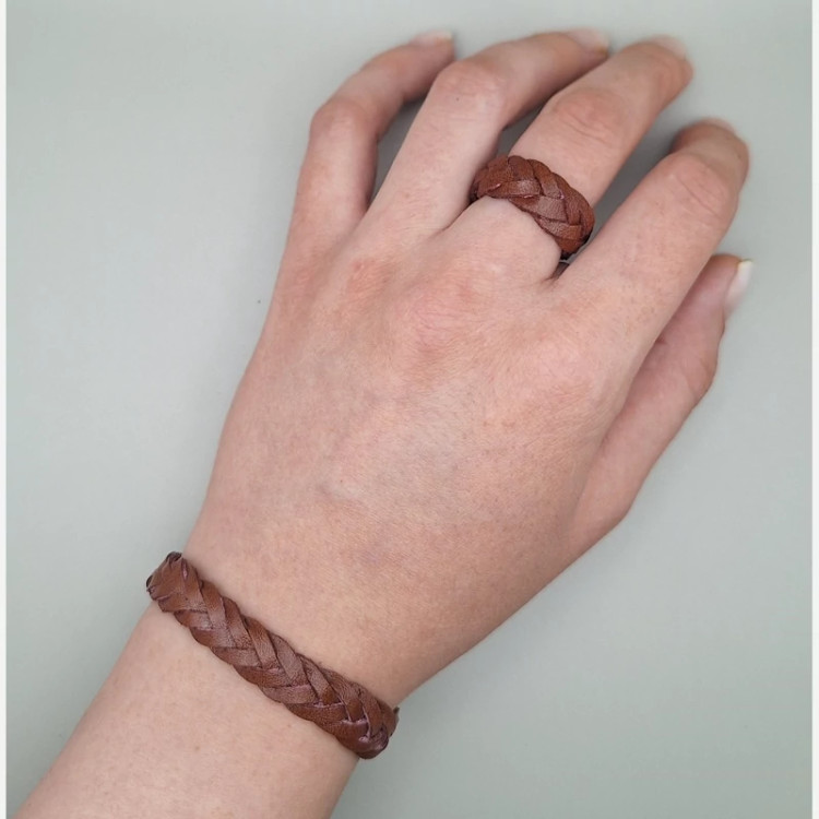 این ست خاص و هنرمندانه شامل دستبند و انگشتر چرمیست که با تکنیک بافت یکتکه (بدون برش جداگانه) و از چرم طبیعی گاو یا بز ساخته شدهاند.