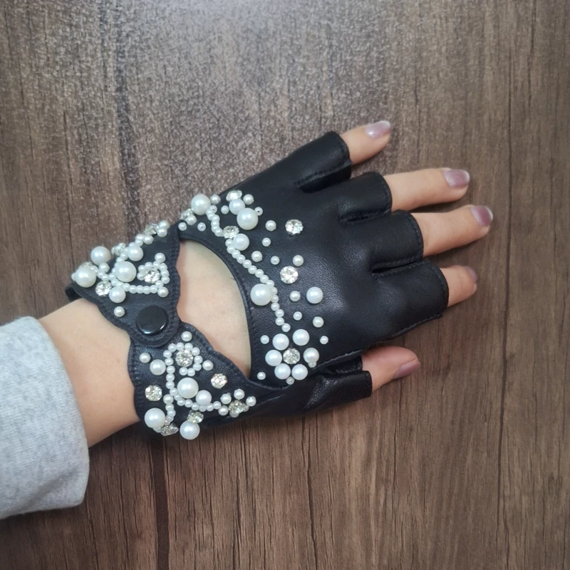 دستکش چرم طبیعی نیمه انگشتی نگین خور و مرواریدی که بصورت پانج و دوخت متصل شده و بسیار محکم میباشد.